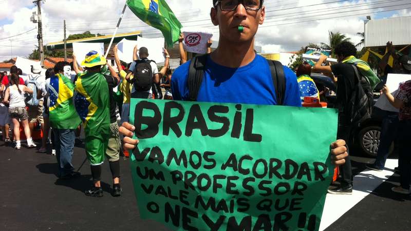 "Brasil, vamos acordar; o professor vale mais que o Neymar". Tendo este grito como o mais usado, os manifestantes de Fortaleza adiantaram a concentração para o protesto no entorno do Estádio do Castelão - programado para as 10h, mas iniciado por volta das 9h em frente ao Makro da Avenida Alberto Craveiro, a principal via de acesso ao estádio.